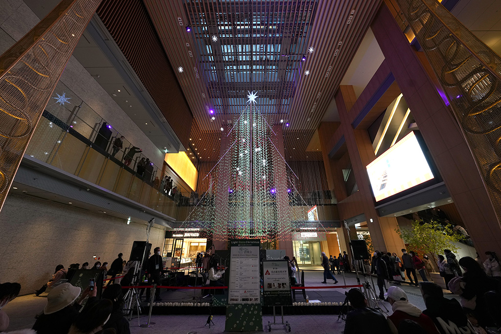 KITTE名古屋 クリスマスイルミネーション「暗がりのクリスマスツリー」は、通常の電飾を使うのではなく自動車部品の製造過程で発生した廃棄プラスチックを、アップサイクル製品として製造された蓄光プラスチックを使って作られたもので、柔らかな光が幻想的なクリスマスツリー。アトリウムの環境照明を計画的に消灯して“暗がり”を作り、蓄光プラスチックのささやかな灯りを楽しめるようにしました。企画した木村さんは「愛知県は工業集積地であり、産業用の電力消費が日本でもっとも高くなっています。そうした現状をもっと知ってもらい、環境問題や節電とリサイクルについて考えてもらえるように企画しました」といいます。