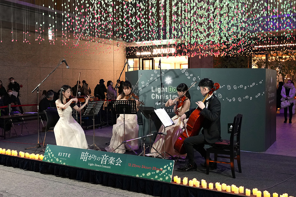 その会場で催されたのが「暗がりの音楽会」。灯りを消した中で、蝋燭に火を灯し一層幻想的な雰囲気の中、演奏が行われました。24日のヒラウチマイ スペシャルバンドは、ポップス系の曲、25日 NUA strings quartettoは弦楽四重奏ですが、どちらもクリスマスらしい演目。薄明かりのイルミネーションと華やかな演奏に、道行く人々も思わず足を止め、ツリーを囲む2階、3階の吹き抜けにも人が集まり、演奏に聴き入っていました。