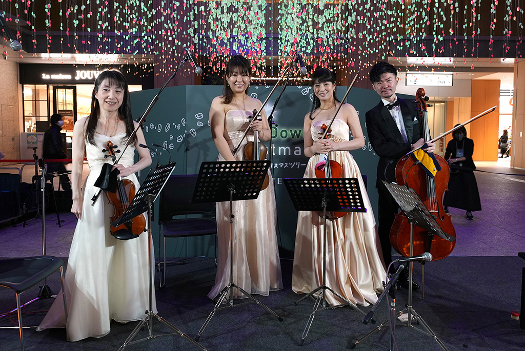 本学デザイン科卒業生の株式会社スペース 木村ユカさん、石黒雄也さんが中心となり企画されたKITTE名古屋 クリスマスイルミネーション「暗がりのクリスマスツリー」の会場にて、12月24日(土)に音楽領域卒業生のヒラウチマイ スペシャルバンド(Vo.ヒラウチ マイさん、Gt. 須賀 奏太さん、B.中島 玄太郎さん、Perc.松原 瑞季さん)、25日(日)は音楽学部卒業生ユニットNUA strings quartetto(Vc. 城間拓也さん、Vn. 村越久美子さん、Va. 大竹温子さん、Vn. 近澤知世さん)が「暗がりの音楽会」として演奏を披露。それぞれ30分と限られた演奏時間でしたが、ロマンチックなクリスマスの夜に彩りを添えました。