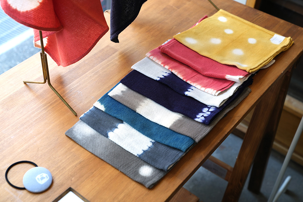 販売ブースは、このプロジェクトで例年お世話になっているSuzusanが手がけるスーベニアブランドの「tetof 1608」の隣のスペースと好立地。また、やはり例年、染色でお世話になる「張正」さんの店舗でも販売させていただきました。また、今年からは張正さんの豆絞り手ぬぐいのB反(染めむらなどちょっとした難点のある二級品)にさらに模様を加えたアップサイクル商品も併せて販売しました(→記事はこちら)。