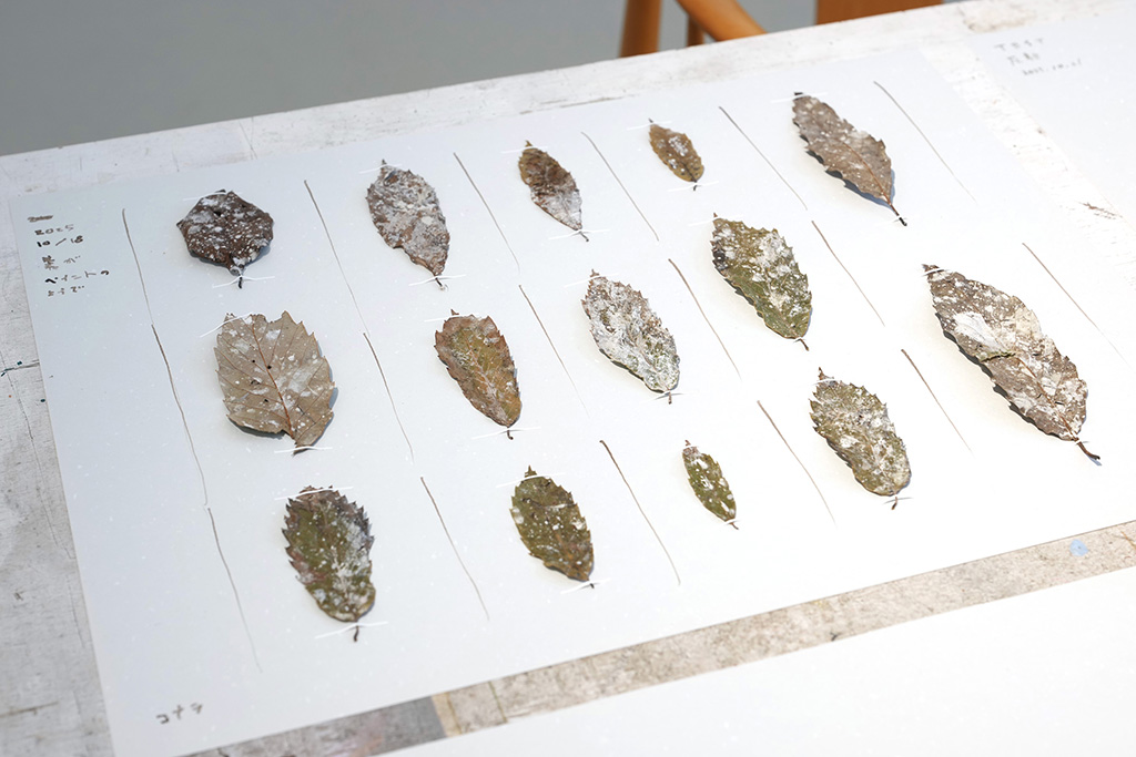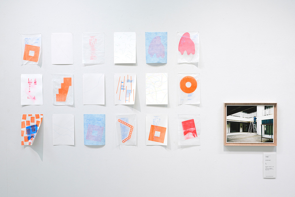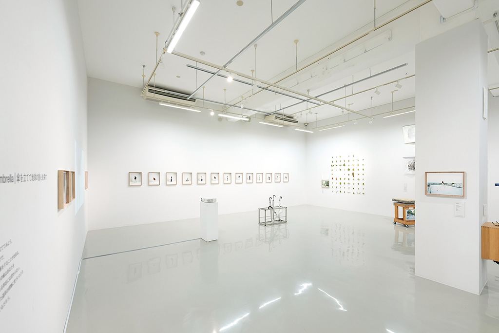 美浜町の川鵜のコロニーを歩きながら自然と人間の関係を再考するフィールドワーク、片手に三本のペンを持って描く線の探求、脚立に立って視点をずらすことで世界の見え方を変える試み、くもりガラス越しにイメージの残像を探る作品、傘という道具の役割と重心を問い直す実験など、どれも“観察する”という行為そのものを作品化したものばかりで、来場者の視点を優しく揺さぶるものでした。