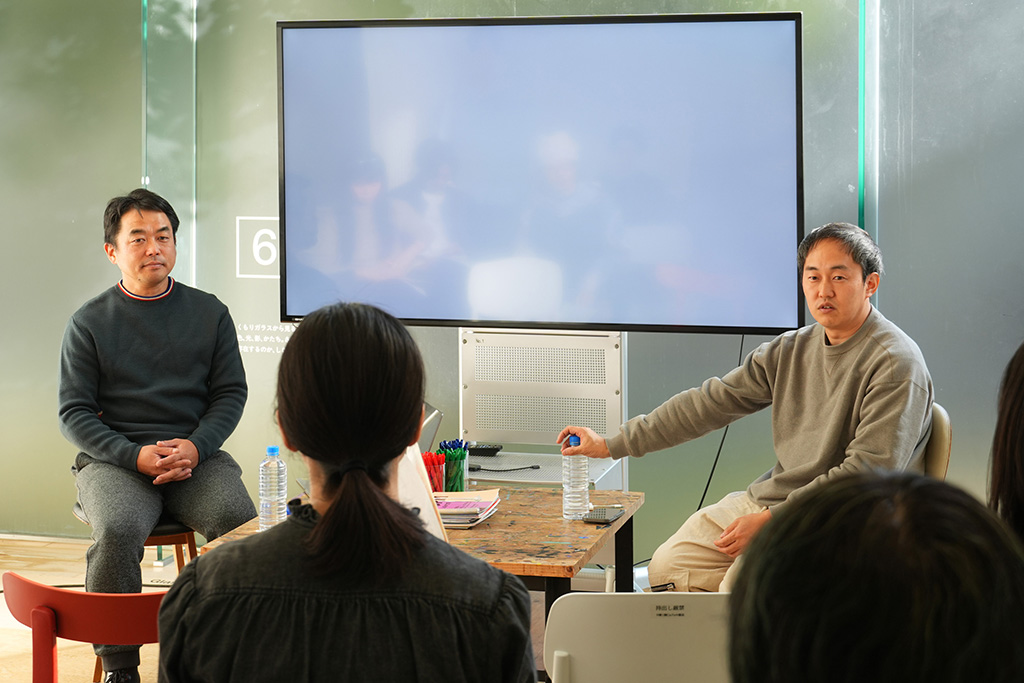 2025年11月16日には、秋田公立美術大学准教授でアーティストの柚木恵介氏をゲストに迎え、原田氏とのトークイベントが開催されました。会場にはデザイン・アート・教育に携わる来場者が多数参加、濃密な対話が繰り広げられました。両者の活動紹介から始まり、議論は次第に「どうすれば既成概念を越え、新しい視点を獲得できるのか」「学生に“気づき”を生み出すにはどうすればよいか」へと広がっていきました。