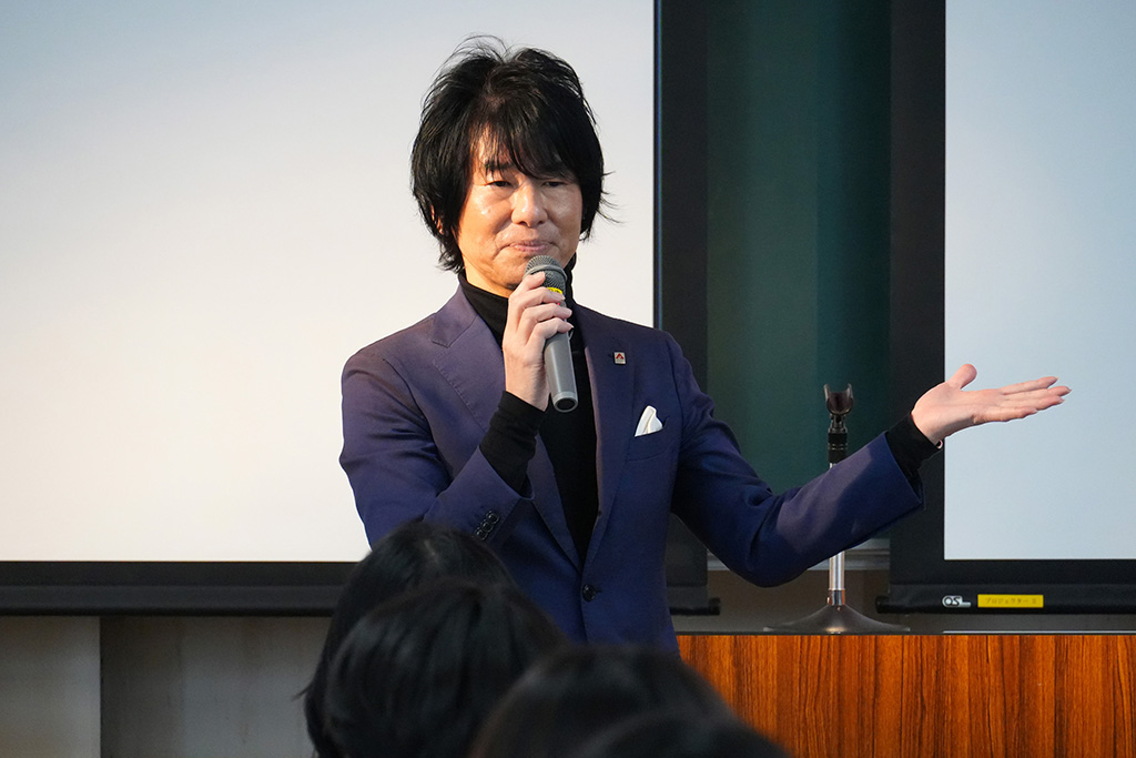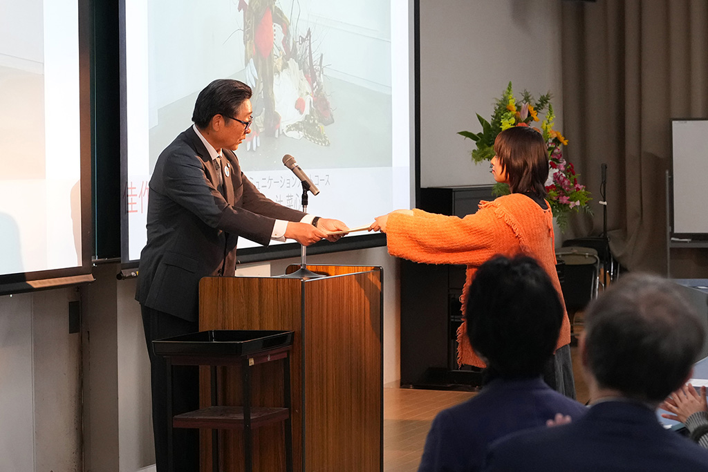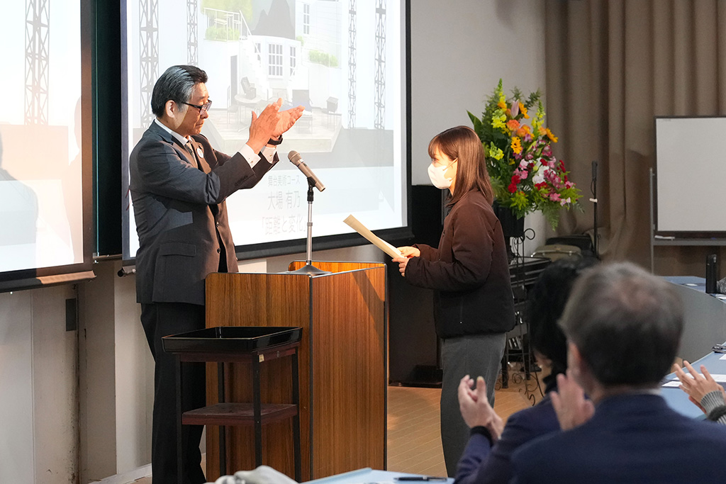 はじめに、本学学長 來住尚彦が挨拶し、受賞者への祝意とともに、作品と作家の双方が輝くことの大切さを伝えました。作品を愛する人は作家自身も愛する存在であり、優れた作品づくりと同時に人間的成長も重要であると強調。「可能性は無限だが、時間は有限」との言葉を贈り、限られた時間の中で挑戦を続け、心に残る作品を生み出してほしいと期待を寄せました。