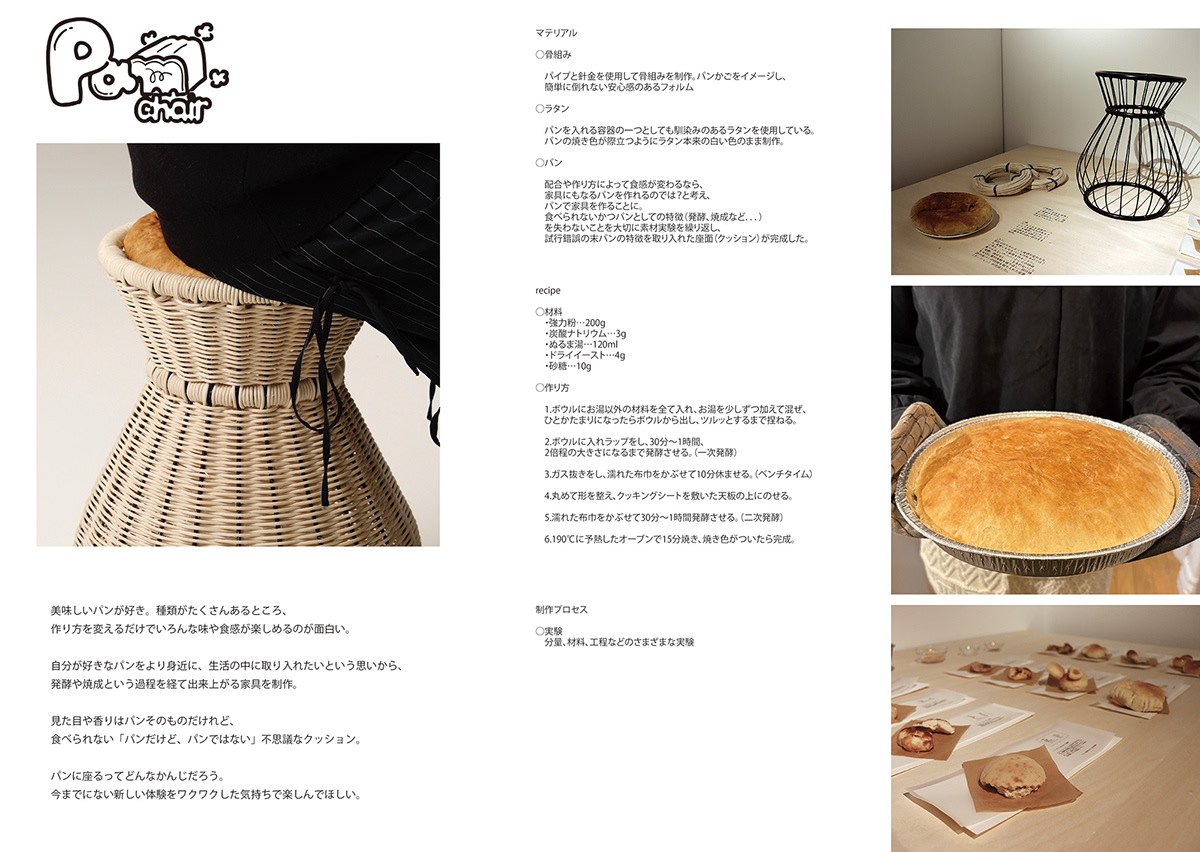 「Pam chair」は、パンの素材や発酵過程を研究し、“座るためのパン”として制作した椅子作品です。