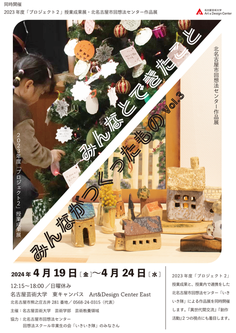 『みんなとできたこと/みんながつくったもの vol.3』と題して、2023年度に実施した「プロジェクト2」の授業成果と、この授業内で連携をした北名古屋市回想法センター・回想法スクール卒業生の会「いきいき隊」による作品展を同時開催します。