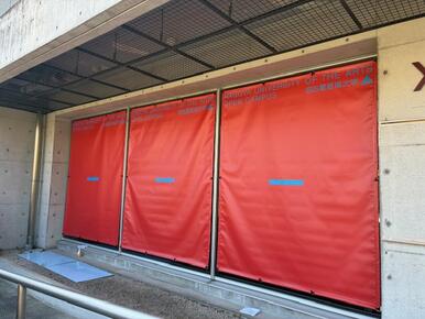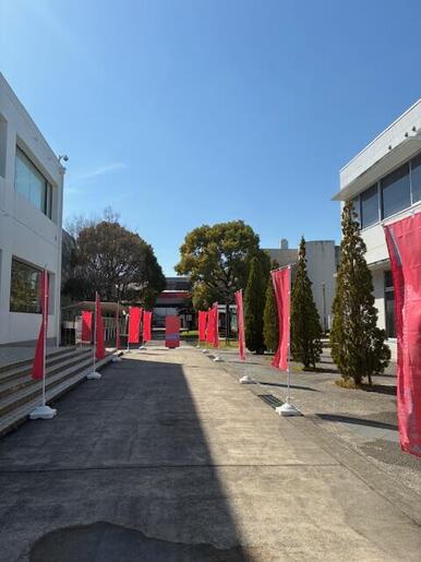 キャンパス中に配置された真っ赤な無地のタペストリーやのぼり。