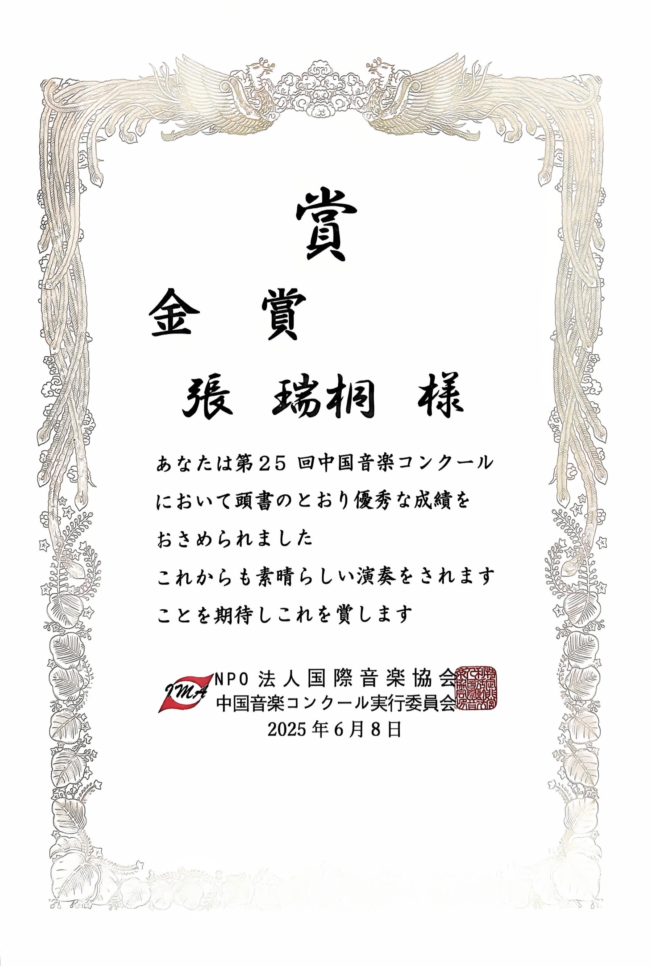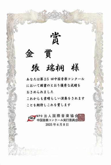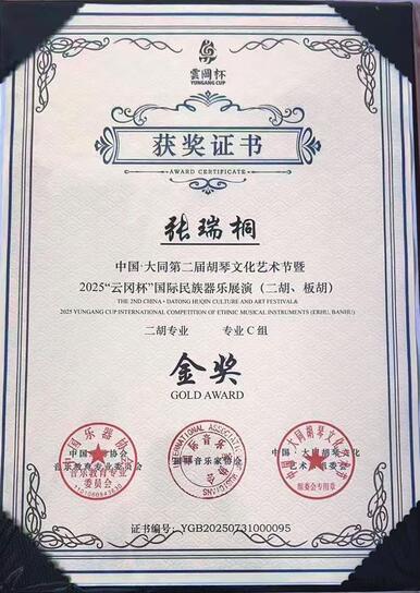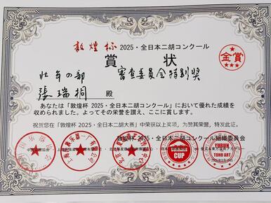 本学大学院(2年次)の 張 瑞桐(ZHANG RUITONG)さんが、2025年6月・7月・9月に開催された二胡コンクールにおいて、日本国内2大会、中国国内1大会の計3大会すべてで金賞を受賞しました。