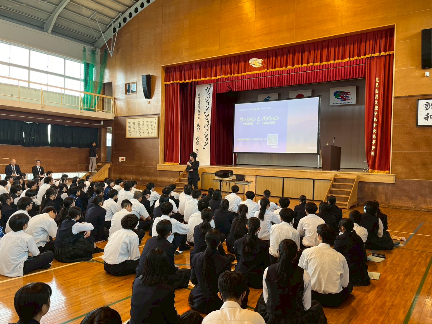 講義風景の写真をご覧ください。同校で書道をご担当されている先生が筆を執ってくださった垂れ幕に記された通り、この日の講義テーマは「ヴィジョンとパッション」。自分自身の未来や、その実現に向けて努力していくことの大切さについて、生徒の皆さんにマイクを向けながら、合計100分にわたり特別講義とグループ演習が展開されました。