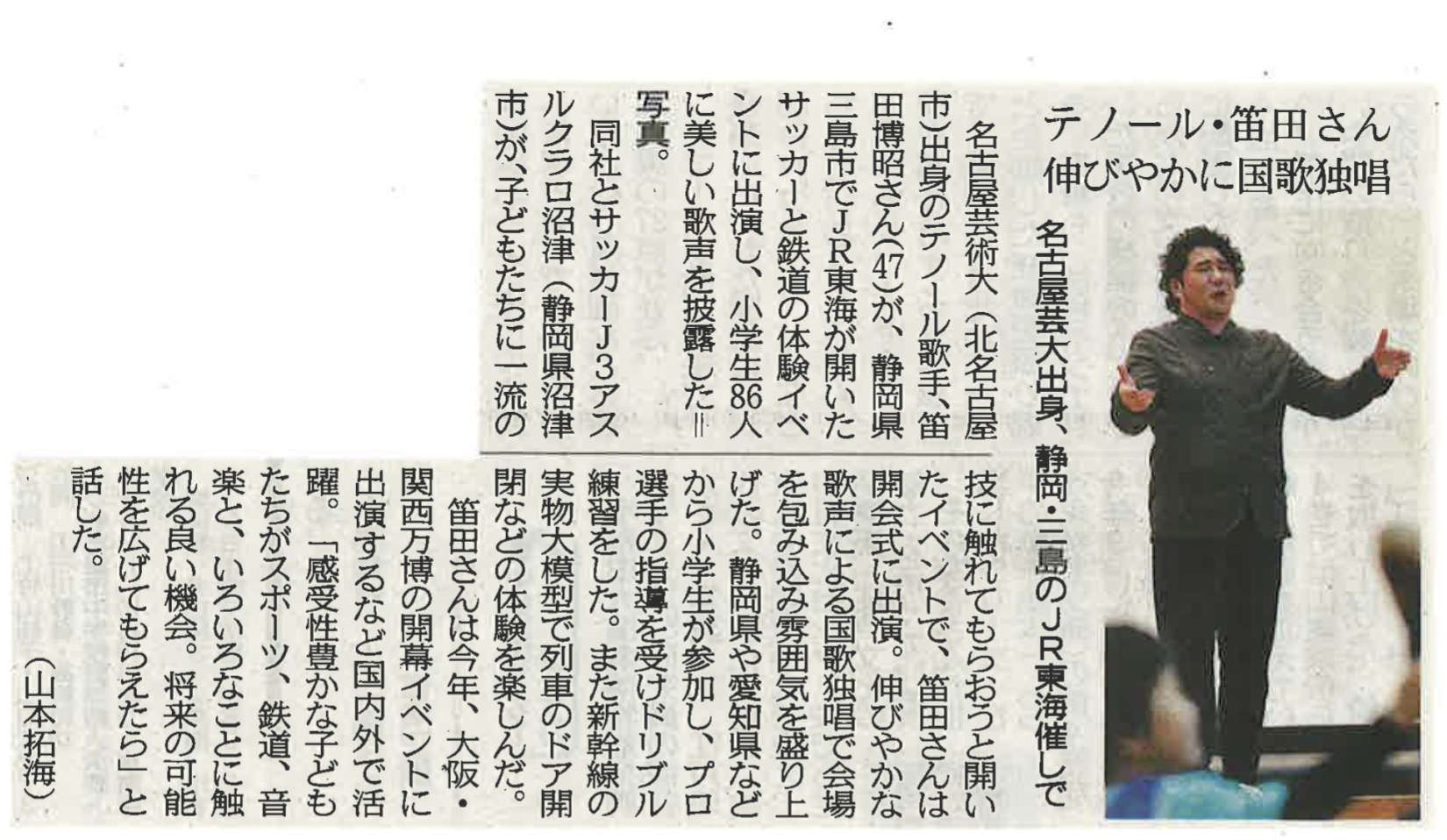【新聞掲載情報!】名古屋芸術大学出身のテノール歌手・笛田博昭さんがJR東海イベントで国歌独唱!