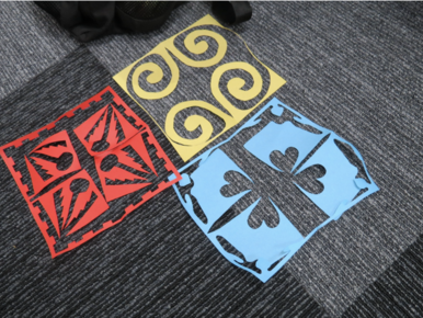 今回の授業では、アトリエコモンズのスペースを利用し、教室を彩る「切り紙工作」に取り組みました。まず、世界や日本の民族衣装の模様を観察し、それぞれの模様には固有の意味が込められていることを学習。その上で折り紙を折り、さまざまな切り込みを入れて開くと、美しい線対称の模様が生まれることを体験しました。