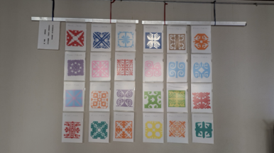 完成した模様をクリアシートに入れてみると、教室を明るく彩る多様なデザインが出来上がりました。これらの作品は、附属クリエ幼稚園の正面玄関の壁面にもさっそく展示され、園児や送迎に訪れた保護者の方々から「きれい」「ステキ」「作ってみたい!」といった声が寄せられました。作品展示が幼稚園の空間を彩るだけでなく、幼児の創作意欲を引き出すきっかけにもなっています。