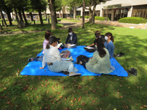 大学の芝生広場での実習として、1分間目を閉じて全身で自然を感じ取る「体でピン!」、