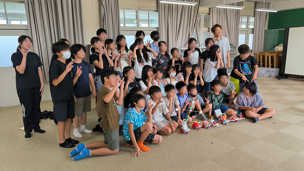 向井大喜【小学校におけるSTEAM教育実践】9月17日(水)鴨田小学校5年生を対象にプログラミング教材を用いたSTEAM教育の授業を実施。授業は2~3時間目に行われ、1クラス30名を4~5人1グループで5班編成し、各班にゼミ学生がついてサポートした。